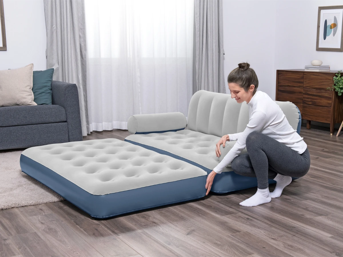 Op een Bestway 3-in-1 Opblaasbare Bank kom jij heerlijk tot rust. Dit grijs-blauwe model is multifunctioneel en dus bruikbaar als bank of bed. Door de afmetingen van 188 x 152 x 64 cm is deze opblaasbare bank geschikt voor twee personen. Zet ‘m dus in de woon- of logeerkamer als er vrienden of familie over de vloer zijn. Lekker weer? Dan verplaats je deze bank in een mum van tijd naar buiten en geniet je daar van het zonnetje. Zorg er wel voor dat je niet meer dan 300 kg op het luchtbed legt. Dat is namelijk de maximale belasting. En heb je geen zin om het hele zaakje op te pompen? Geen probleem, dat doet de ingebouwde luchtpomp voor je!