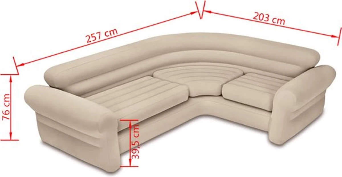 Zit je in een verhuizing en heb je een tijdelijke bank nodig? Of wil je het woonkamer gevoel gewoon lekker doortrekken op de camping? Dan is de Intex opblaasbare hoekbank een wel hele goede aanwinst. Deze opblaasbare hoekbank heeft een afmeting van 257 x 203 x 76 centimeter en is daardoor geschikt voor 5 personen. Genoeg plek om met het gezin of wat bezoek op te loungen!
